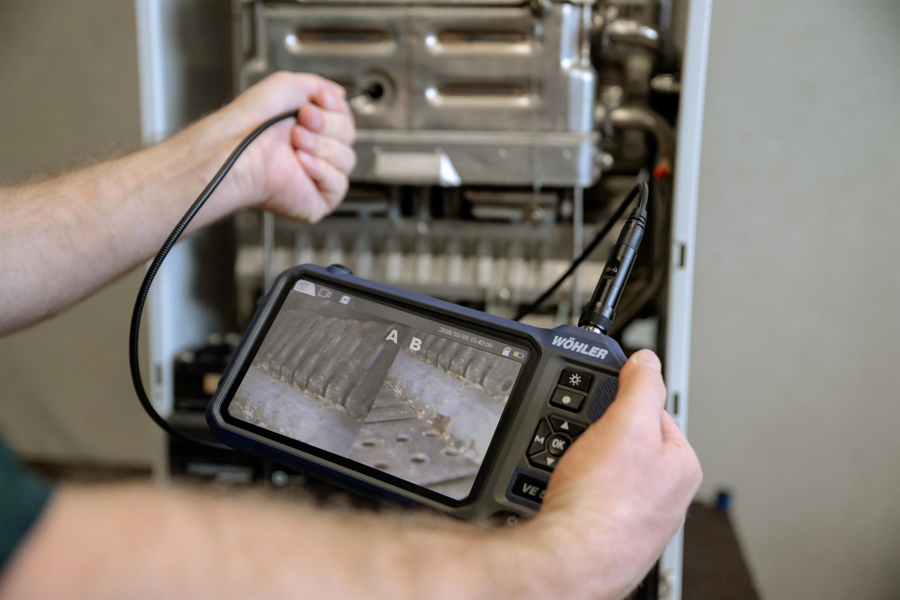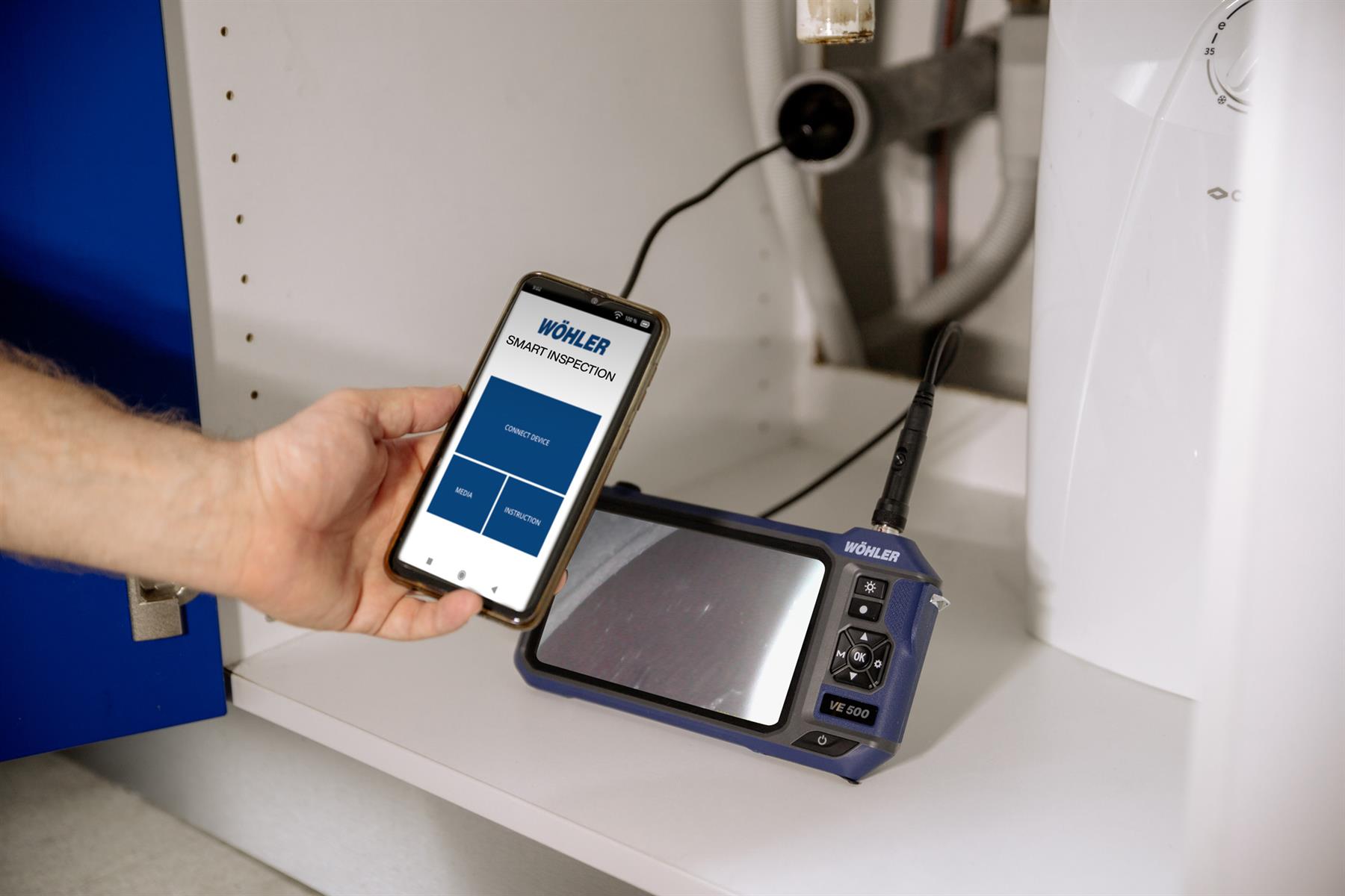 Außerdem kann die Bild- und Videoübertragung in die Wöhler Smart Inspection App erfolgen, um einen Schadensbericht möglichst einfach zu erstellen. Der Splitscreen Modus erlaubt es, beide Kamerabilder der Kombisonde auf einen Blick anzeigen zu lassen. Schon eine kleine Öffnung ab Ø 6 mm in einem Fliesenkreuz genügt, um die Installation hinter der Wand zu begutachten. Das Wöhler VE 500 HD-Video-Endoskop ist ein unverzichtbares Instrument für die Inspektion von schwer zugänglichen Bereichen.