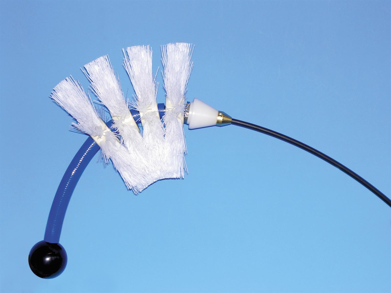 Problemfälle beim Reinigen von Abgasleitungen, Rauchrohren und Lüftungsanlagen sind bestens bekannt. Enge Bögen, schlecht zugängliche, besonders knappe oder fehlende Reinigungsöffnungen führen immer wieder zu schwierigen Situationen. Mit dieser Neuentwicklung (Schweizer Patent angemeldet) können wir in vielen Fällen Lösungen anbieten.((mehr)) Kernpunkt bildet dabei eine robuste, hochflexible Stahl-Achse mit abriebfestem Schutzmantel und Führungskugel. Mehrere, wirbelartig angeordnete Reinigungsbürsten mit kräftigem Nylonbesatz werden gleichmässig auf dieser Achse befestigt. Somit passt sich die Bürste sehr gut der jeweiligen Situation im Rohr an und gleitet optimal um enge Bögen. Geführt wird Sie dabei von einer Leitspitze mit Führungskugel. Die Bürste besticht auch durch Ihre hervorragenden Reinigungseigenschaften. Zudem wird das Einfahren in die Reinigungsöffnungen bei engen Verhältnissen erheblich erleichtert. Ultraflex Nylon M10 passt auf sämtliche Kaminruten mit M10 Gewinde!