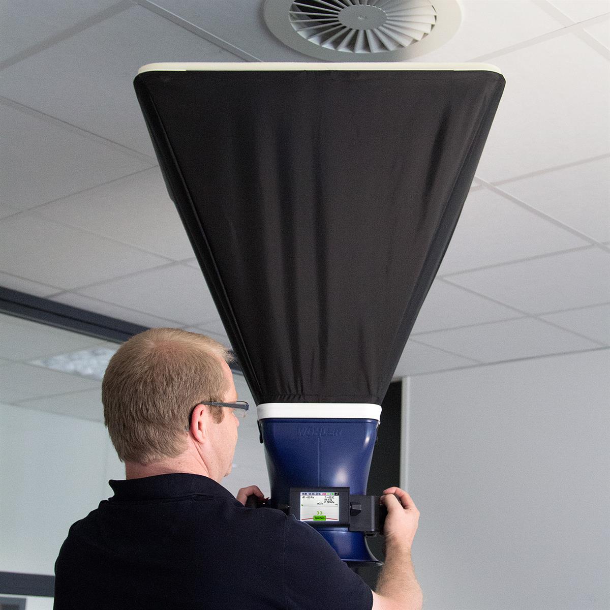 Schnelle und genaue Ermittlung von Zuluft- und Abluftvolumenströmen an Luftdurchlässen und dezentralen Lüftungsgeräten z.B. gem. EN 12599/16211. Präzise Messung von Teilvolumenströmen an Durchlässen mit größeren Abmessungen, wie z.B. an Schlitzauslässen
